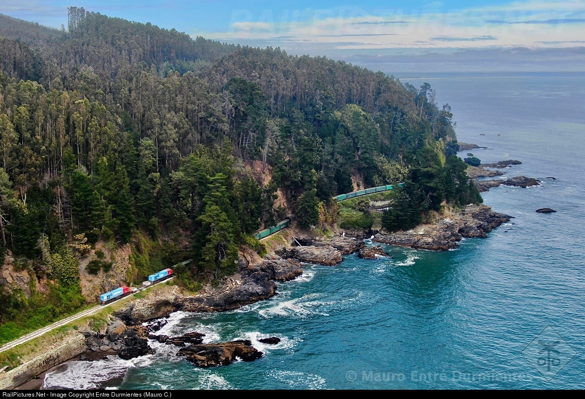 | Freight train of FEPASA railroad, loaded with cellulose from CELCO Horcones in Arauco city, bordering the Pacific Ocean in Gulf of Arauco, goes through the "twin tunnels" (tunnels 6 and 7).