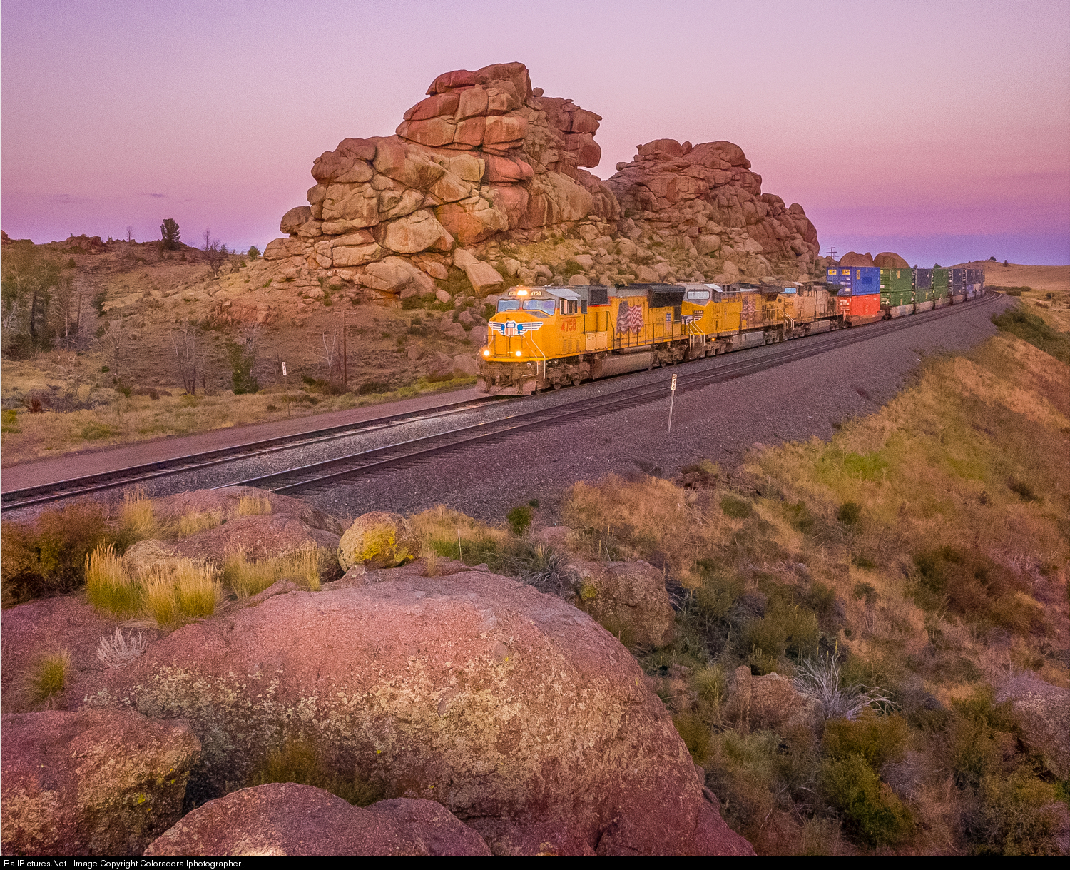 A slow moving Z train is moving past the Great Pink Panther moments after sunset near Sherman Hill. A truly southwest sunset, purples, reds, pinks, nature’s splendid show sharing some time with a westbound Z at Dale Junction.