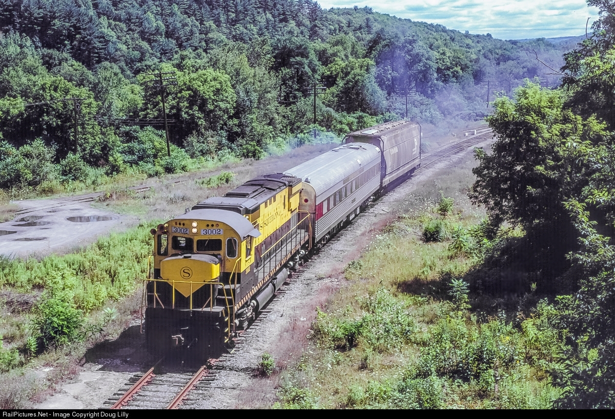 Susquehanna C430 3002 lays down a smoky trail at Chenango Forks, New York. The Susquehanna hosted many excursions all over the system during this time period, and one car from its fleet is being moved north.
