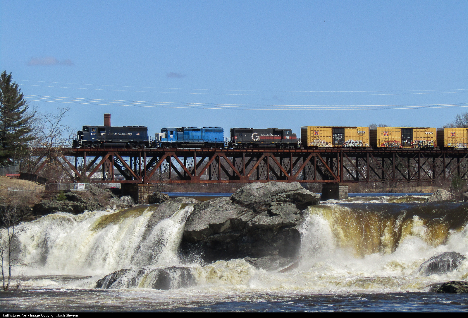 | On April 17th, 2019 I went down to the Great Falls between the twin cities of Auburn and Lewiston to watch trains cross the large bridge over the falls. This happened to be one of my favorite shots on that day. RUPO was the first of three trains we saw. In the lead was MEC 507 which has since been repainted back into the Guilford Rail System paint scheme. The water at the falls was high from all the snow melting upstream. |