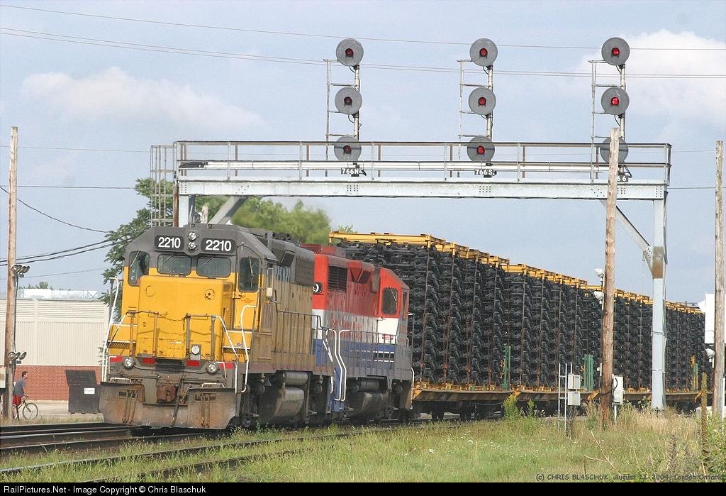 LLPX 2210 and RLK 2210 pull todays frame train onto the Dundas sub and are going to back their train up into CN's London yard. Here they are passing under the Eastbound signals.