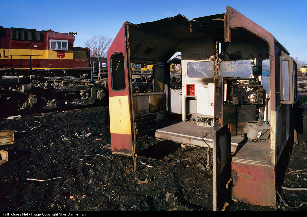 The scrappers are in the middle of cutting up a group of Wisconsin Central locomotives at North Fond du Lac, Wisconsin, as seen on Christmas day 1994. The cab of EMD SD45 No. 6655 now sits on the ground, twisted and torched, in front of SD45 and GP30 trucks that are being saved as spare parts. Soo Line GP30s that went to WC were equipped with Alco trucks, hence the AAR type B truck on the left.