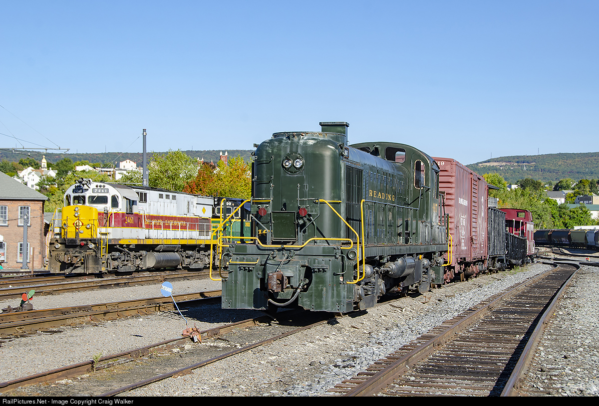Reading Company RS-3 467, built by the American Locomotive Company in May 1952, was sold to the Peabody Coal Company. It was later purchased – and restored – by the Reading Historical Society. This engine is stored at the Steamtown National Historic Site, and is often displayed with freight cars of the same era, as seen here on a crisp early autumn morning. In the background is power belonging to the Delaware-Lackawanna Railroad, with DL C-425 2461 (ex-DL 811, ex-BCOL 811, originally EL 2461) coupled to three other ALCOs. (Scranton, Pennsylvania – September 29, 2013)