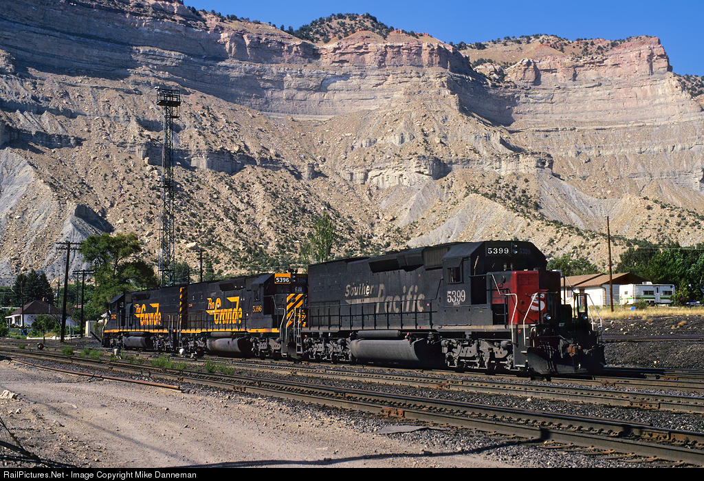 A set of Rio Grande power moves toward the enginehouse at Helper, Utah, on the afternoon of August 6, 1996. Rio Grande had a total of 73 EMD SD40T-2 Tunnel Motors bought between 1974 and 1980. After the Southern Pacific merger in 1988, a total of 16 of these units were repainted and relettered SP, but still retained DRGW reporting marks and numbers, like Rio Grande No. 5399 seen here.