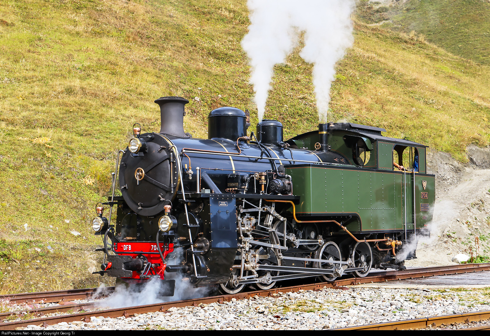 | Cogwheel steamlocomotive HG 4/4 # 704 of the Dampfbahn Furka Bergstrecke in Furka DFB station. The locomotive pulled the first train of the day, the "hiker train" or "diesel train" 325 from Realp to Oberwald. |