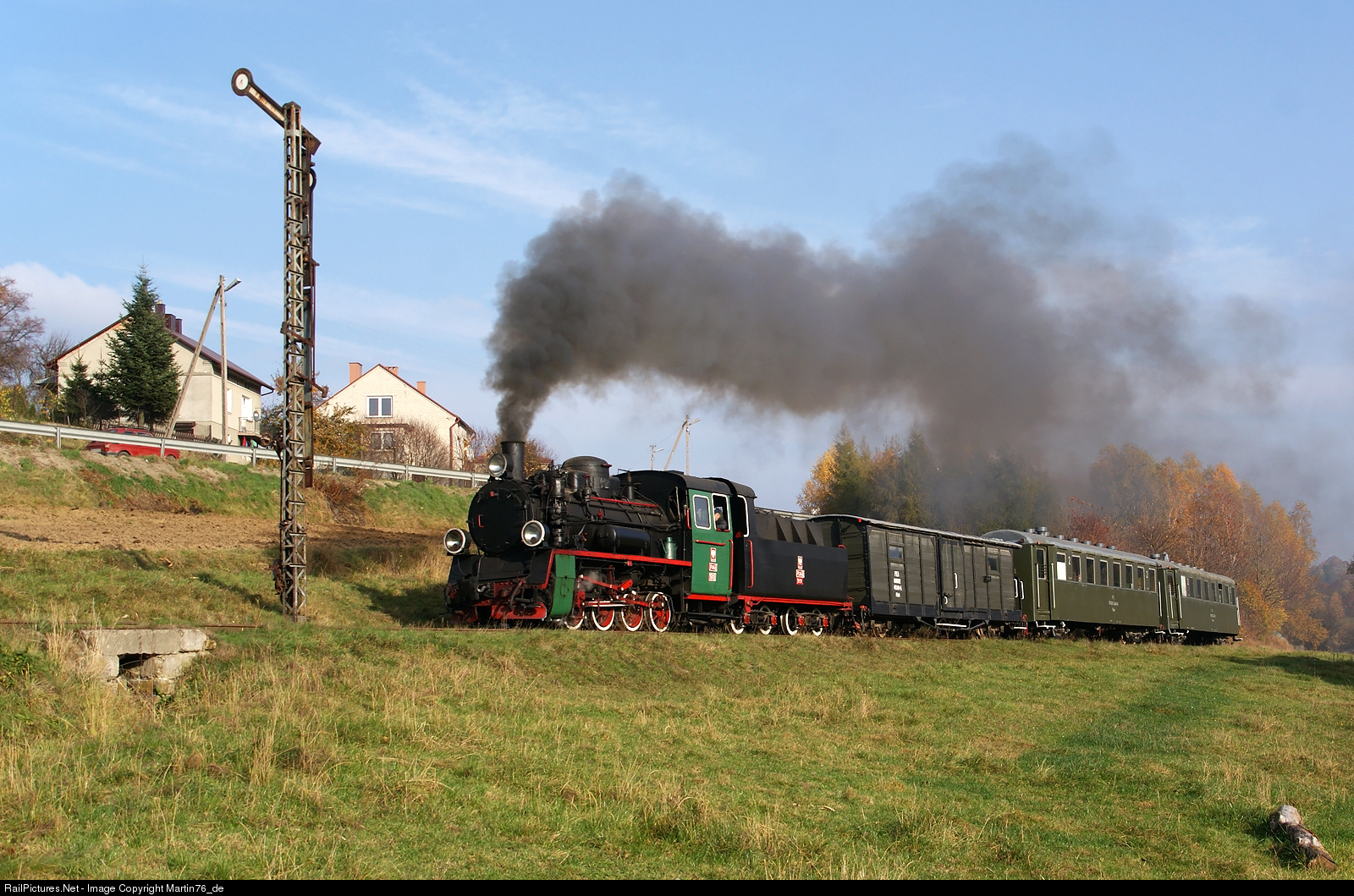 | The narrow-gauge 750mm steam locomotive Px48-1919 brought from Gniezno to Przeworsk by a group of German railway enthusiasts, hauling a special train from Przeworsk to Dynów, passes the station's semaphore Jawornik Polski.