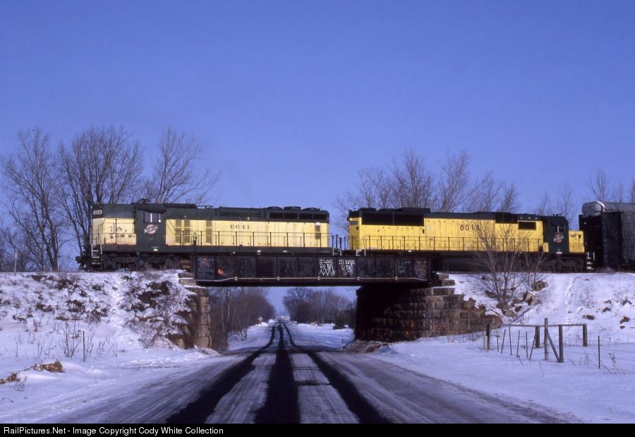 | Chicago and Northwestern SD18R 6641 and SD60 8014 crossing over La Barge Rd east of Sono Junction WI December 1991. These two units are either leading a westbound towards Hudson and the Twin Cities or are helpers pushing on an eastbound from the Twin Cities. Mike Guss Photo from my Collection. |