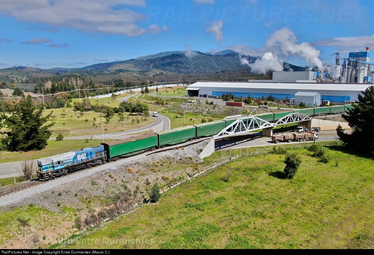 | EMD G8 with cellulose wagons, in load maneuvers inside the Celco Nueva Aldea pulp mill, crosses a railway bridge over the plant's private road.