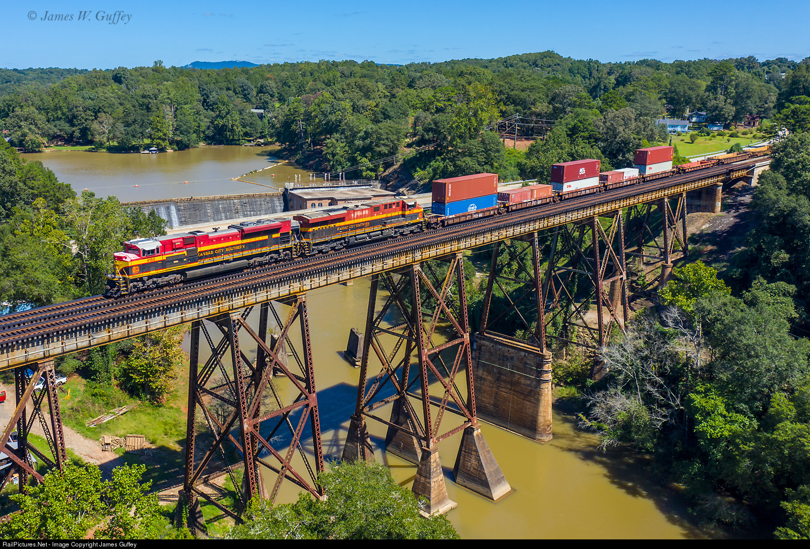 Southbound Charleston-Atlanta intermodal 237 has only the loads shown in the photo with several thousand feet of empties as they throttle up to track speed leaving Greenville and cross the Saluda River.