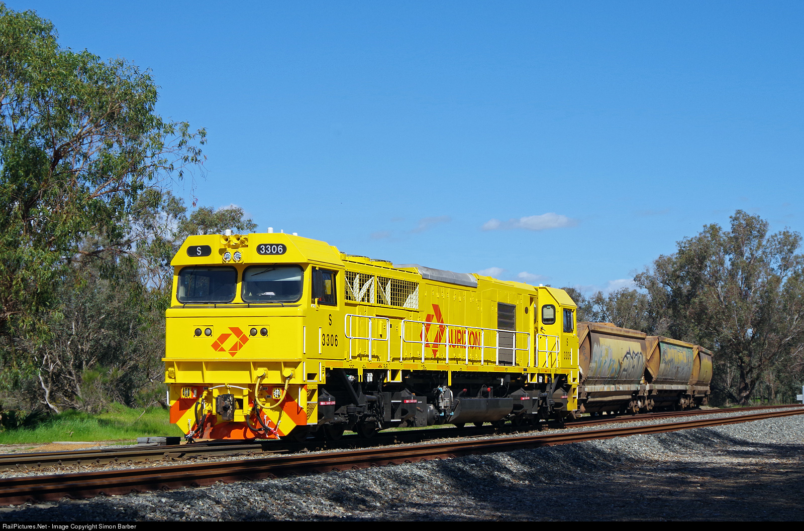 S3306 brings a loaded bauxite train away from the Alcoa refinery at Calcine.