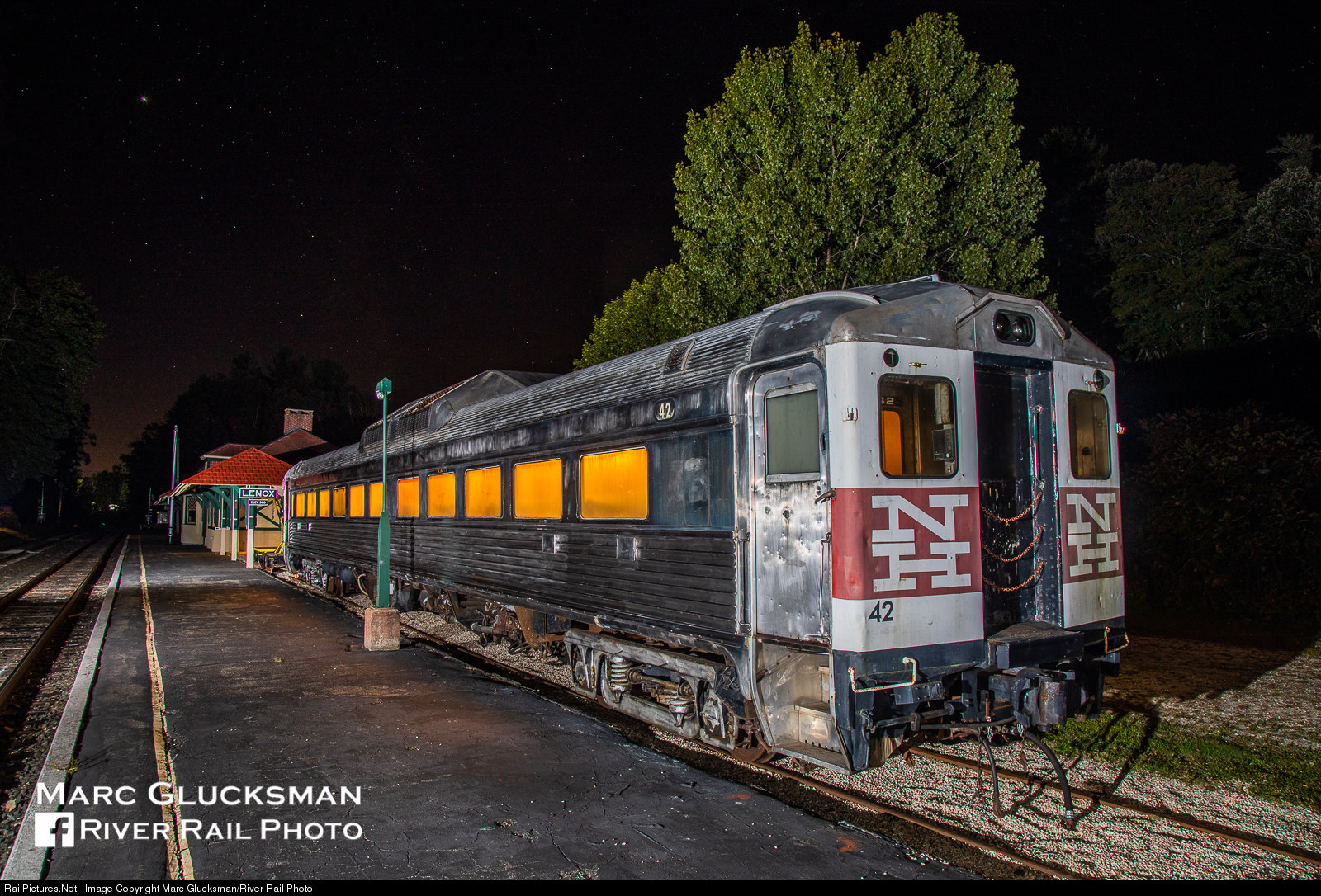 Fire up the Firestone! When the Fall River Museum collection was dispersed, the Berkshire Scenic Railway Museum stepped in to care for former New Haven Railroad RDC-1 42. Originally worn by another car that was scrapped, the name "Firestone" was added to 42, named after the Firestone tire plant in Fall River, MA. On the night of Saturday, September 19, 2020, it poses in front of the former NY, NH & H station in Lenox, MA.