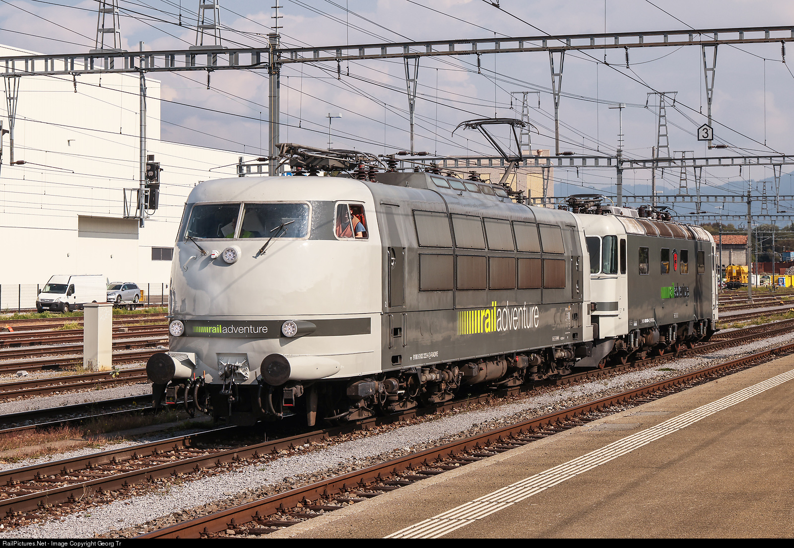 Locomotive 103 # 222 of Railadventure (former E 03 # 222 of the Deutsche Bundesbahn/Deutsche Bahn, built in 1974). The 7780 kW locomotive is still approved up to 280 km/h, with the bogies of 103 # 118 and was initially used throughout Germany for test and measurement runs for the Research and Technology Center Minden (FTZ). By November 30, 1989, it had retired from the regular stock of vehicles and was redesignated 750 # 003 of DB Systemtechnik as successor of the FTZ continued these operations and maintained the stationing of the locomotive in Minden. In 2005 it was re-subscribed to 103 # 222. In 2015 103 # 222 was auctioned off to RailAdventure for 551,000 €. In 2015 the locomotive has again received a general inspection with repainting in the corporate design of RailAdventure at the Dessau plant. The locomotive is seen in St.Margrethen, pulling the Re 620 # 003 of Railadventure, former Re 6/6 # 11603 prototype of the SBB. The 103 # 222 is not approved to pull trains in Switzerland because lack of ATP, but allowed to move in stations under own power.