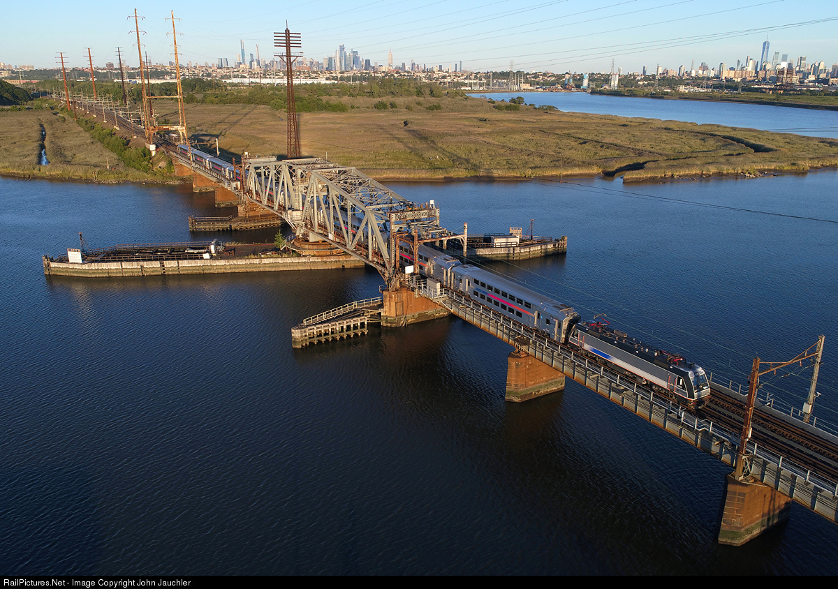 An NJ Transit set of Bombardier MultiLevel coaches is southbound out of New York's Penn Station, having just made its station stop at Secaucus Junction. Here, it crosses the Hackensack River on the soon-to-be-replaced Portal Bridge, with the New York skyline in the background.