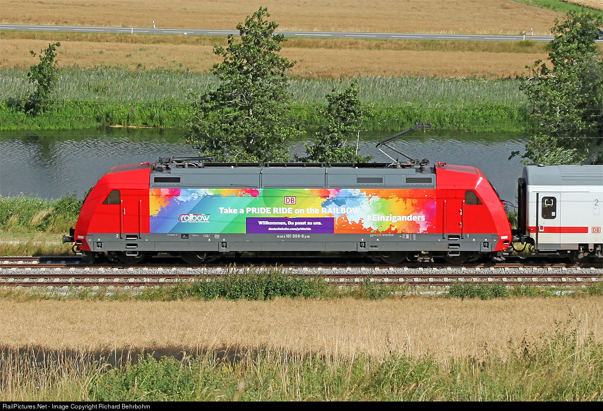 | Locomotive 101 066 has a publicity paint for celebrating diversity at DB (German railways). It is written "take a pride ride on the railbow". The message of DB is welcoming people without prejudices. |