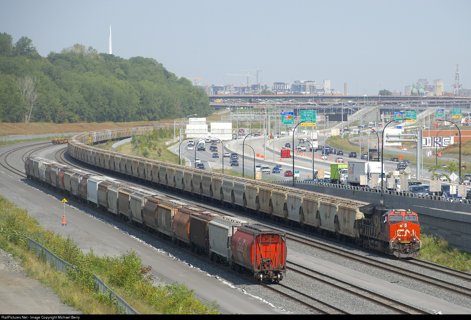 CN 731 has 252 empty potash cars (along with GE's CN 3022 up front and CN 2957 mid-train, for a total of 1,020 axles) as it approaches Turcot Ouest where it will get a new crew.