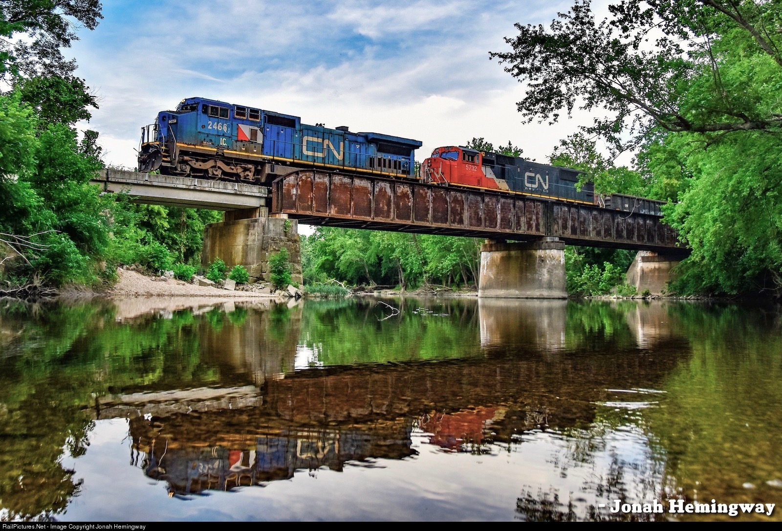 A rare consist on the Springfield to Blytheville Manifest passes over James River.