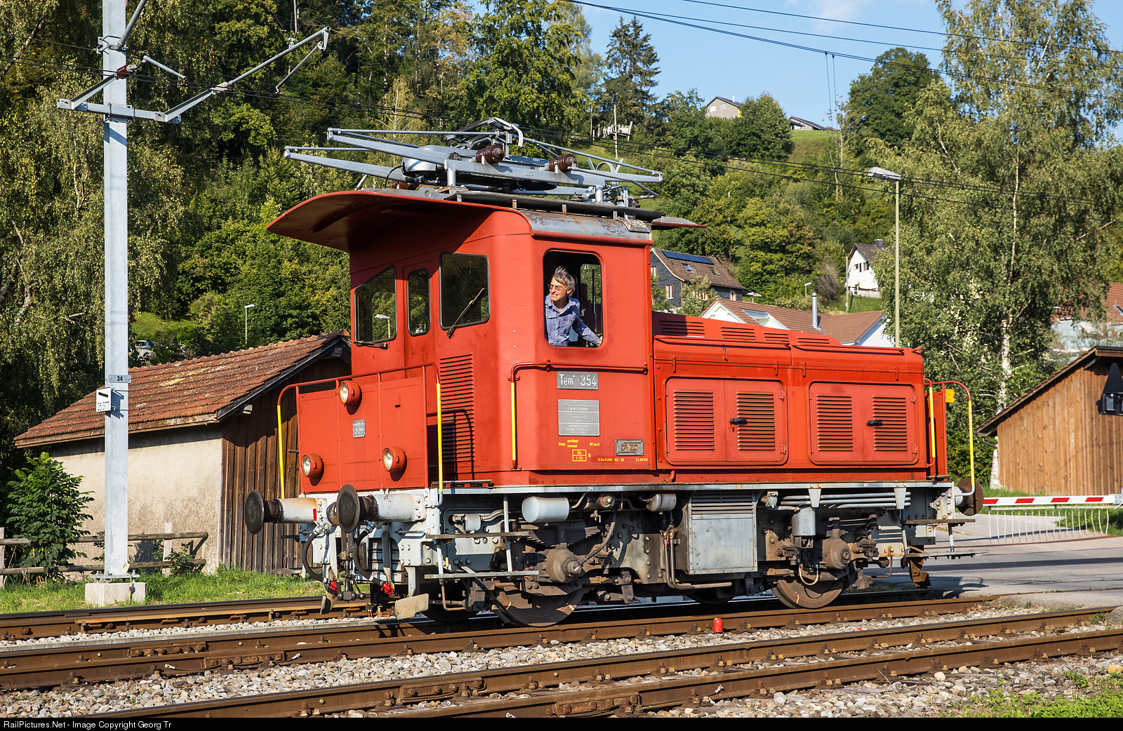 Small electro/diesel shunter, called tractor, Tem III # 354 of the Dampfbahn Verein Zürcher Oberland (DVZO) in Bauma. The vehicle with 260 kW from the overhead wire and 145 kW when running with diesel power, was built in 1961 by SLM, BBC and SAAS for the SBB and sold to the DVZO in 2007.