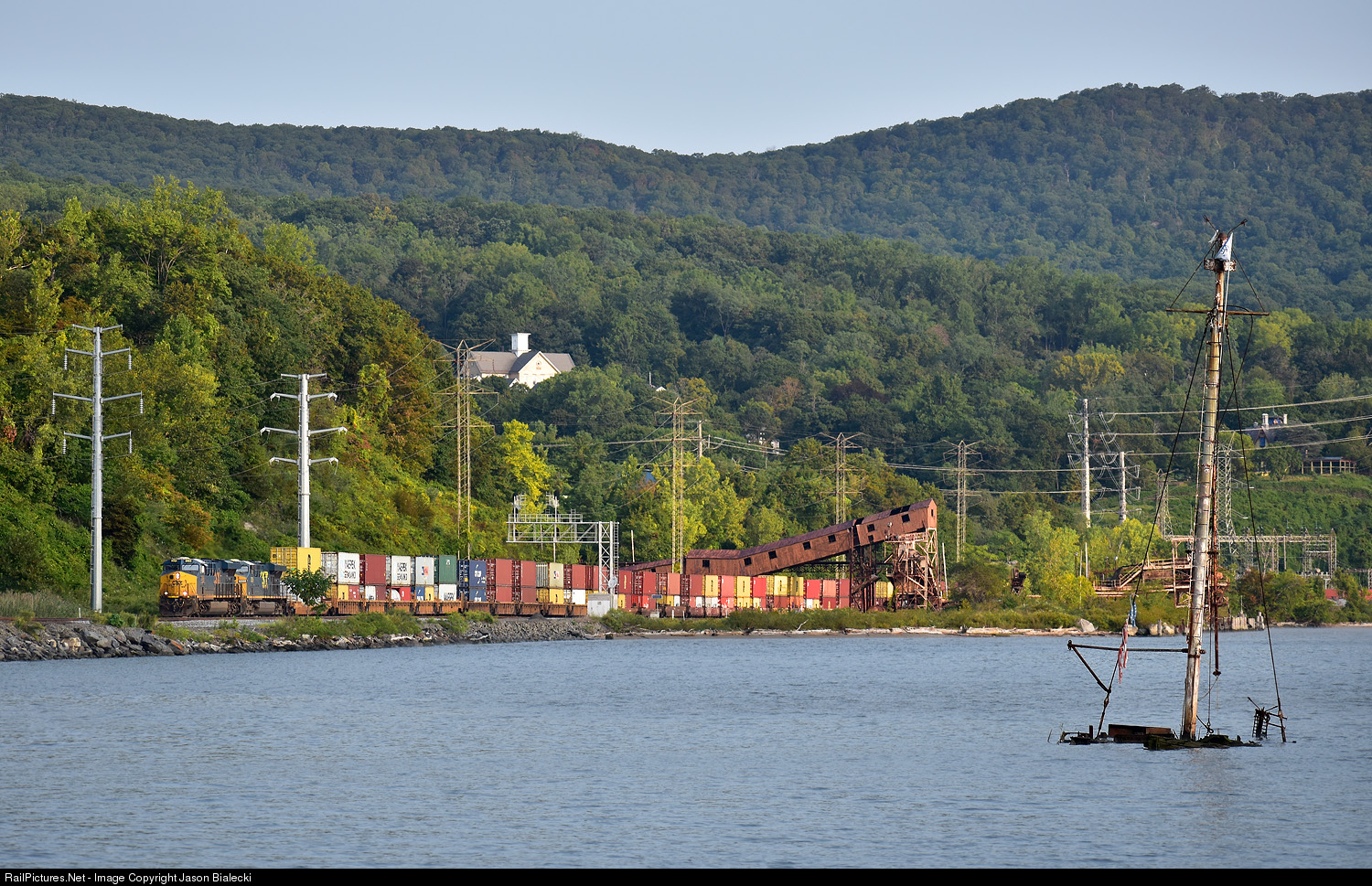 | Old Glory Still Hangs - Here is railfanning the CSX River Subdivision from Stony Point Battlefield. The north shores of the historic park offers scenic views of the Hudson River, freight line and region. A southbound stack train is passing beneath a dilapidated stone aggregate conveyor left from mining operations of stone from the Tomkins Cove Quarry. Also in view is a fishing boat which was run aground and abandoned in the 1980s. Remnants of an American Flag still stand on the sunken vessel . |