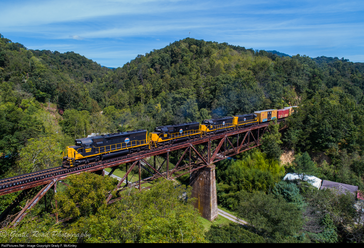 Southern Pacific #8845 in a former life (now WAMX #4201) leads the westbound T-31 Canton turn across the high bridge just east of Canton, NC on a beautiful first day of Fall.