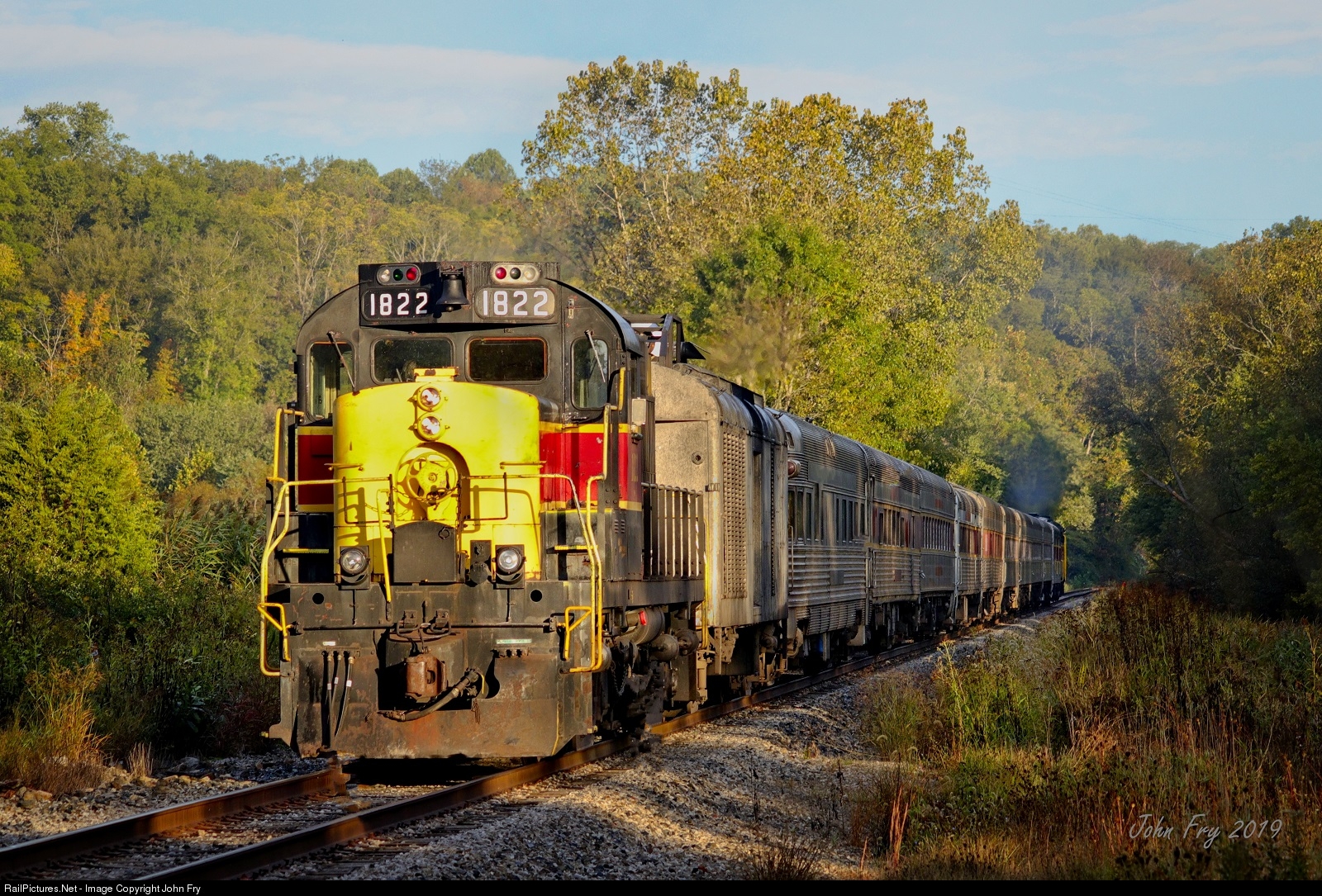 | RS18 #1822 trails as the daily train deadheads north to Rockside station to pick up riders for the day's first run. Fall colors are just beginning as the morning sun finds a spot between the trees to light up the nose of this classic loco. |