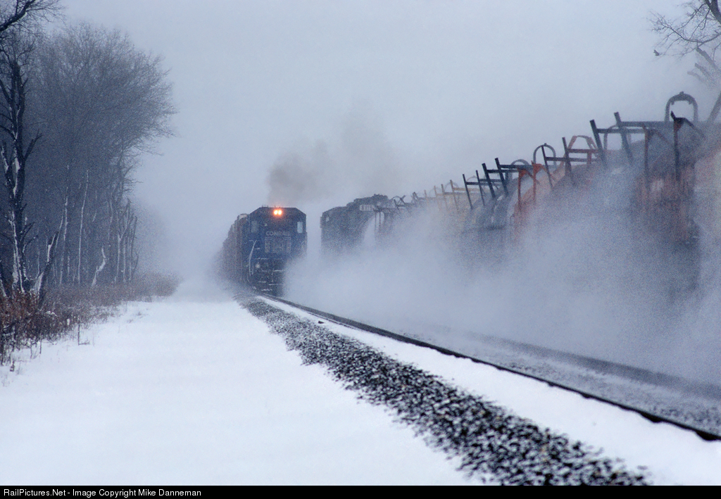 During lake effect snowfall from nearby Lake Michigan on a bitterly cold day, Conrail’s ELPR freight meets an eastbound steel coil train at speed east of Rolling Prairie, Indiana, on January 15, 1994.