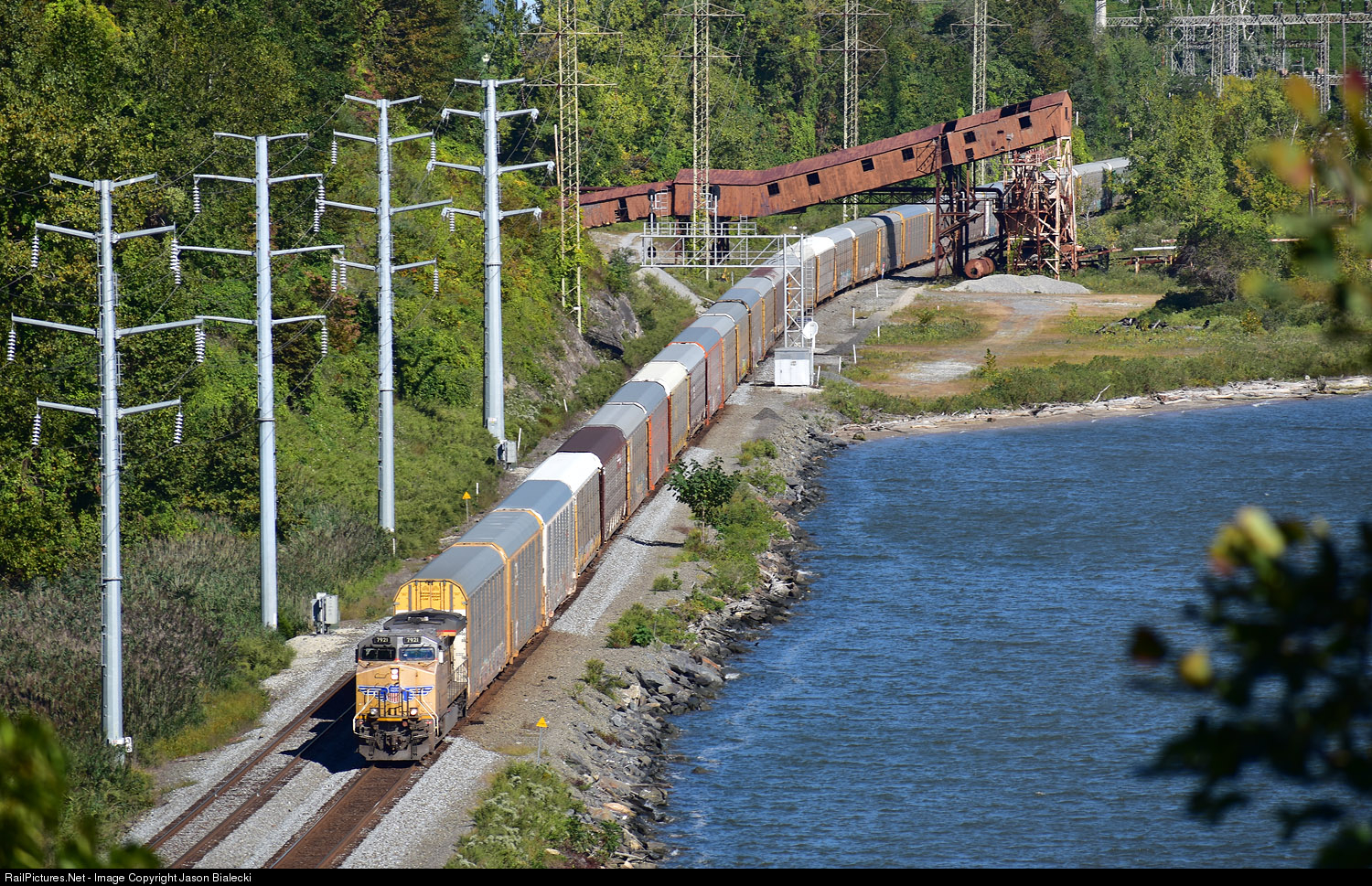 King's Ferry Overlook - UP led auto carrier train on the CSX River Subdivision passing an abandoned stone aggregate conveyor once used to move quarried stone to barge for transport. Photo taken from atop the hills of Stony Point.