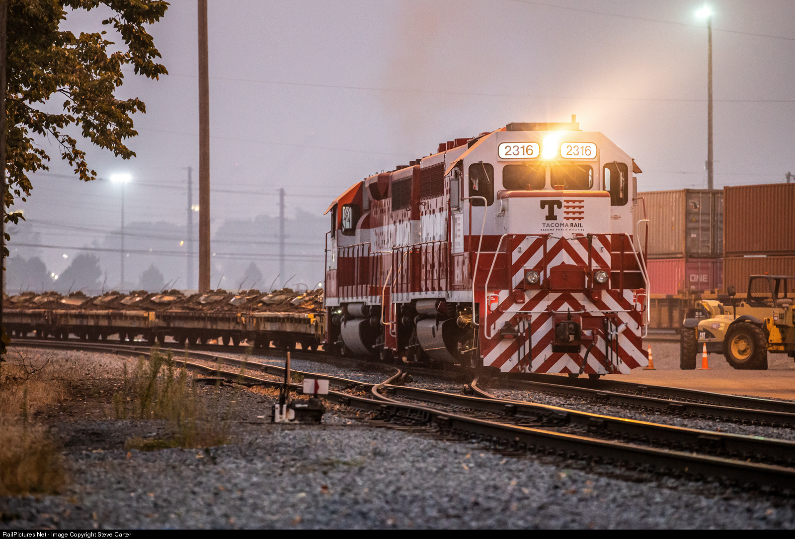 On an evening of smoke filled skies a Tacoma Rail job is delivering a cut of military cars to the North Intermodal Yard for loading on yet to arrive RO-RO ship. An interesting load of the new robotic armored horseshoe crabs fill the first few flat cars.