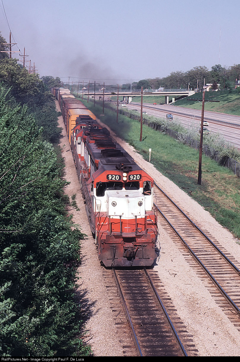| A Springfield bound train along I-44 and just a few minutes after departing Lindenwood yard, St. Louis, MO. The SD45 shows off the unique L-shaped windshield option that only a few roads went for. The 2nd unit is easily identified as a GP35 with the main air reservoir tanks on the roof.