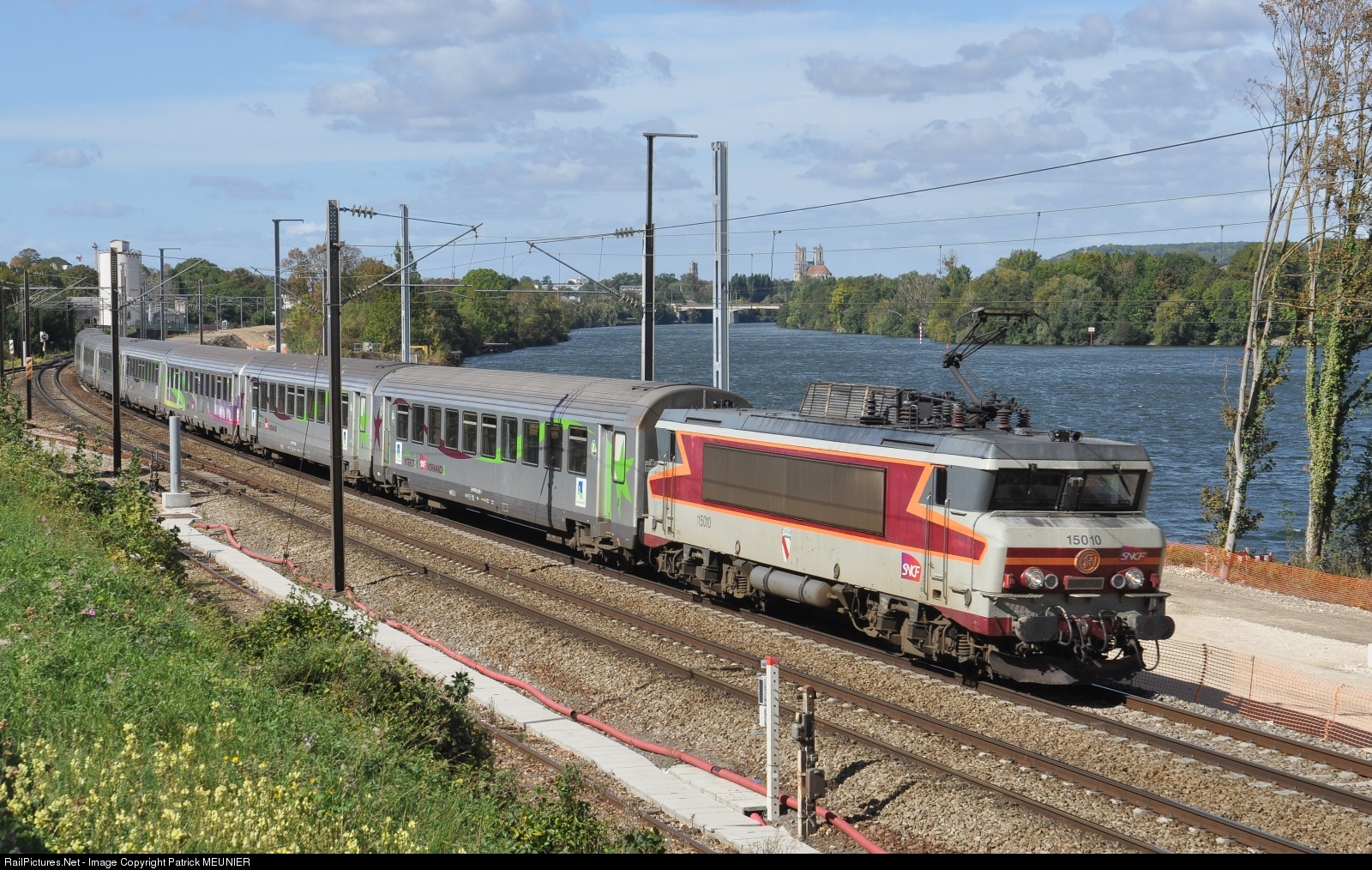 | This train Caen-Paris is passing Guerville, alongside the river Seine. This engine was delivered in June 1973 |