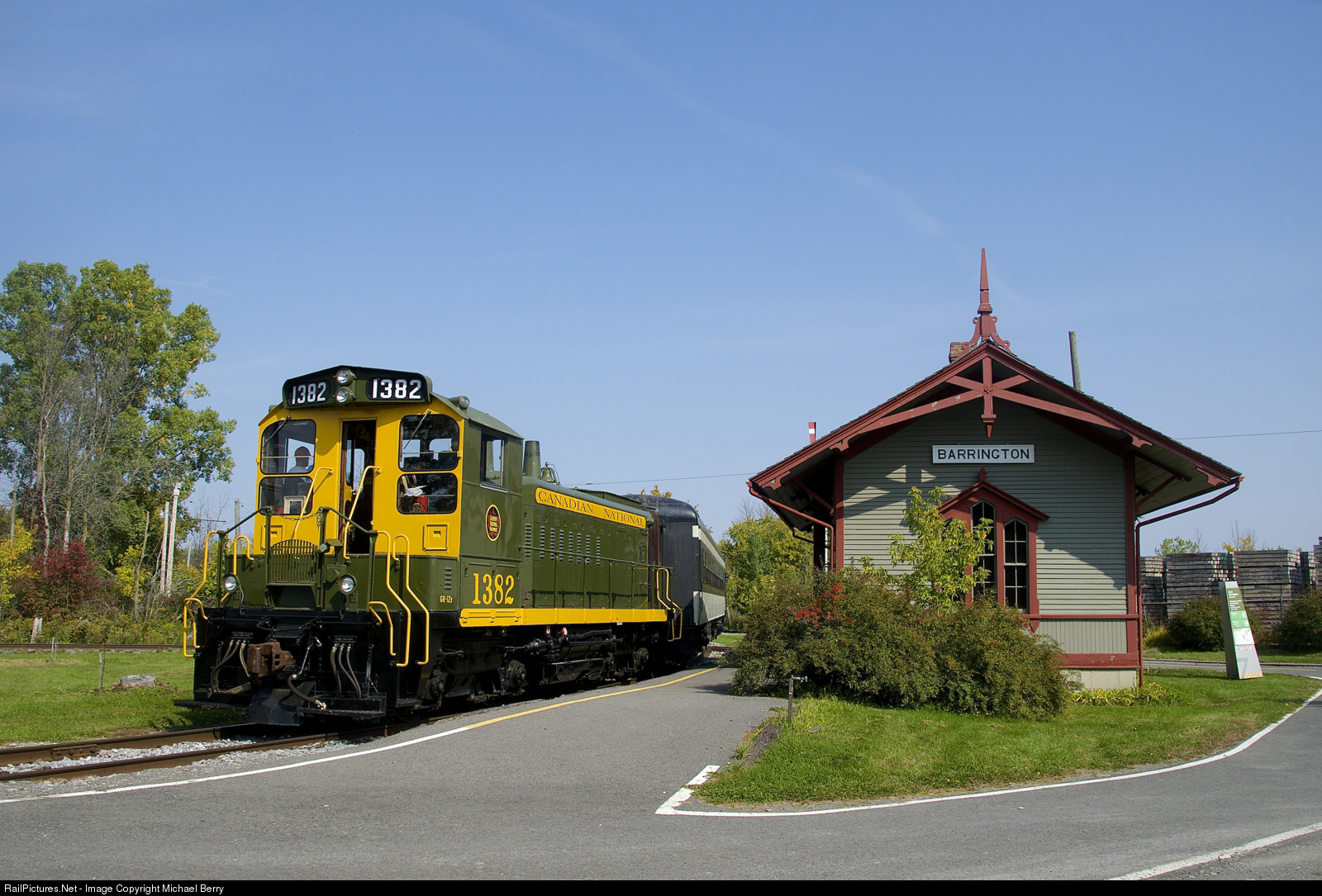 CN 1382 pushes an excursion train past Barrington Station at Exporail.