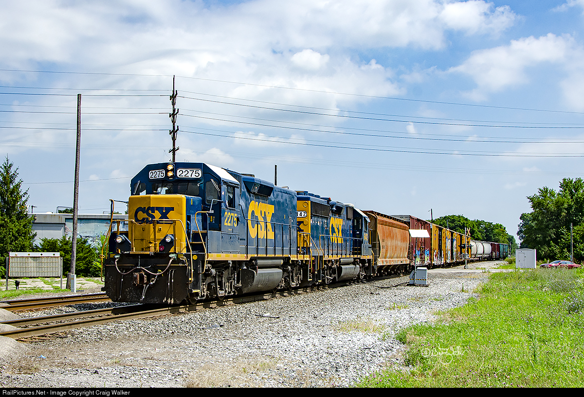 CSX Transportation’s St. Louis Line Subdivision, made up of segments of former parallel New York Central (east of Terre Haute IN) and Pennsylvania Railroad lines (west of Terre Haute). While Penn Central kept both lines intact, PC successor Conrail downgraded the duplicate mains to reduce redundancy. The St. Louis Line Sub runs from Indianapolis IN west/southwesterly to East St. Louis IL. A short 11-car CSXT train, led by Road Slug 2275 (ex-CSXT GP35 4414, originally Chesapeake & Ohio GP35 3574) and GP40-2 6442 (ex-CSXT 6326, nee-Baltimore & Ohio 4428), passes through town heading west under a pleasant midwestern summer sky. (Terre Haute, Indiana – July 11, 2016)