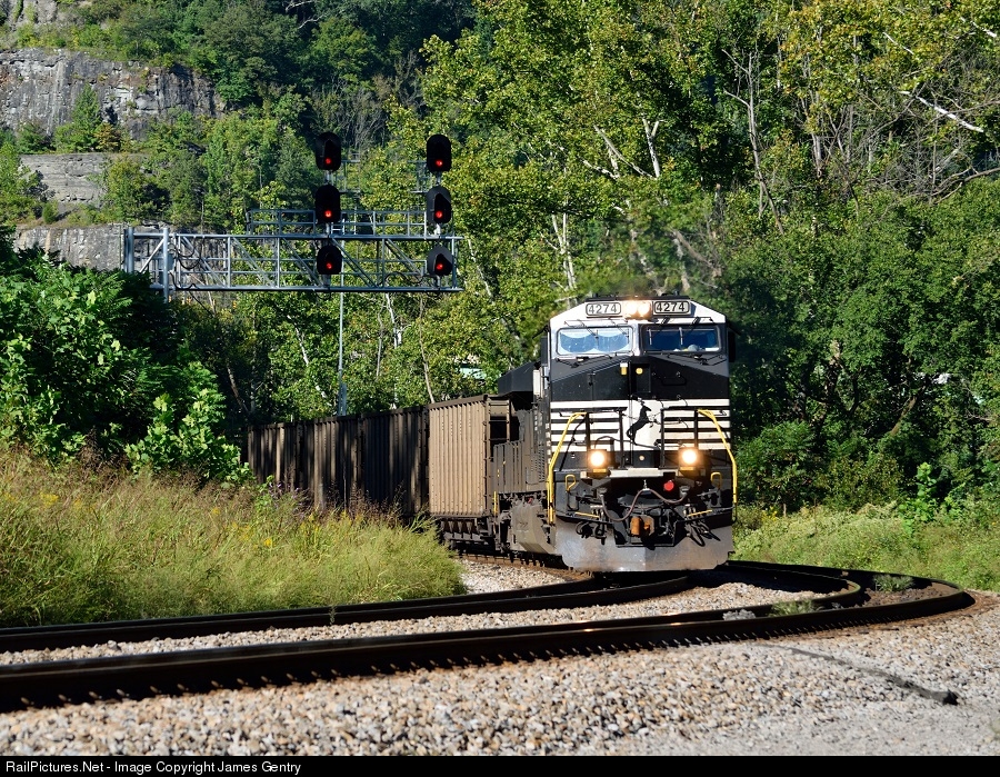 | Empty NS U001 (Pocahontas Symbol) rounds the bend and under the signal bridge at Gate after completing a crew change at Williamson yard. Prior upon entering Williamson from the east, this train had a history of high balling. I should know because I paced it from The Hatfield Tunnels to the yard itself. |