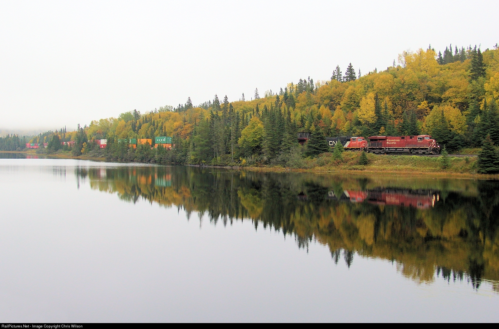 | CP ES44AC 8857, CN SD75I 5770, & CP AC4400CWM 8018 have 113's stacks well in hand running alongside Ripple Lake. Fog off Lake Superior makes for a nice scene with the colours in their prime on the North Shore. |