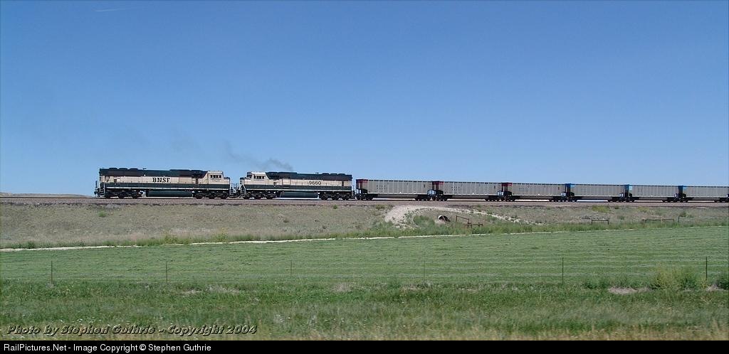 | BNSF 9820 and BNSF 9660 working as a DP units bring up the rear on a set of coal empties at Orin, WY. |