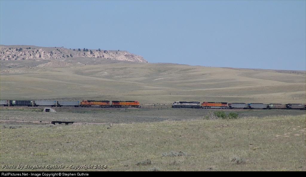 BNSF 5651 with empties and BNSF 9691 with loads meet just east of Orin, WY.