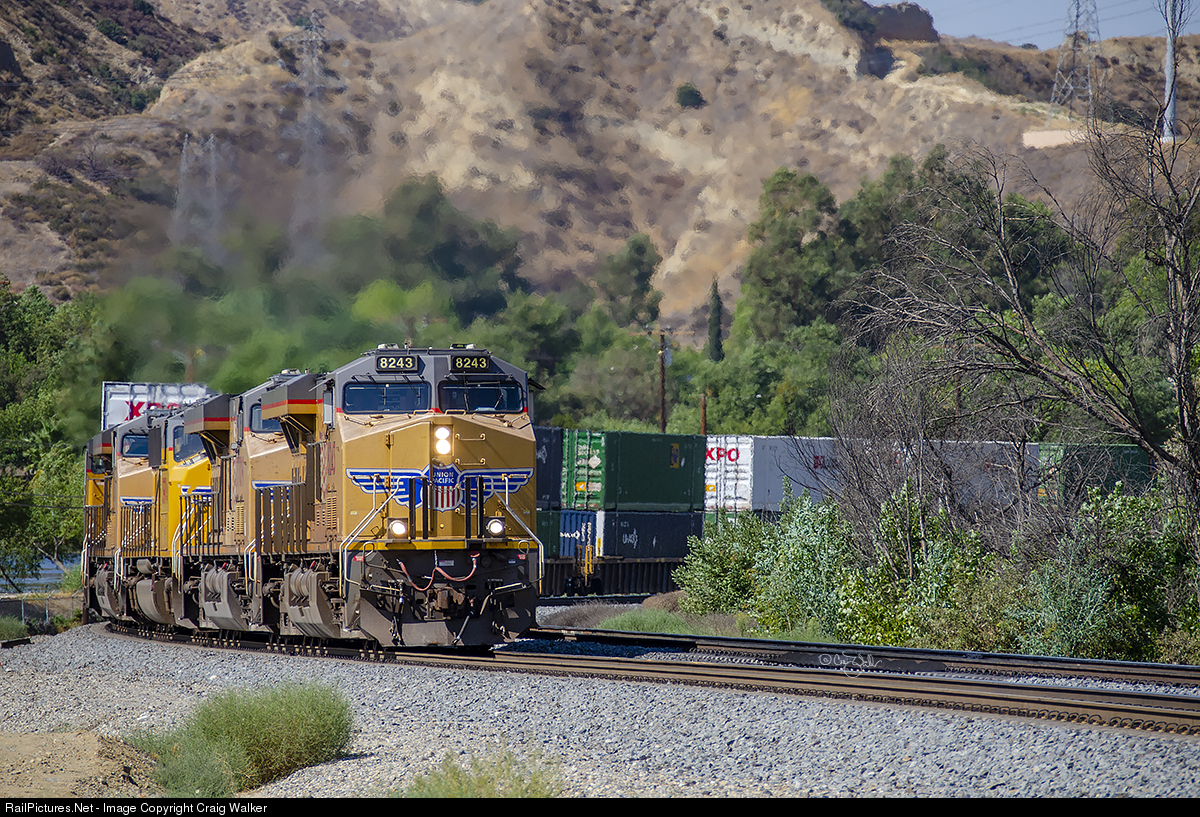 A Union Pacific "UPS, Expedited Intermodal" train (UP ZCIG2 28) climbs upgrade in San Timoteo Canyon after originating in the railroad’s Industry Yard (in the City of Industry) 52-miles back, and destined for the Global 2 intermodal facility in Proviso, Illinois. UP ES44AC 8243, ES44AC 7709, SD70M 3974, ES44AC 7856 and AC4400CW 6405 are providing 21,600 horsepower up front, with AC4400CW 5554 assisting mid-train with another 4,400 hp. And, no wonder 26,000 was required, as this train was 12,210-feet long, with 165 loads weighing 9121 tons. (Redlands, California – September 28, 2020)