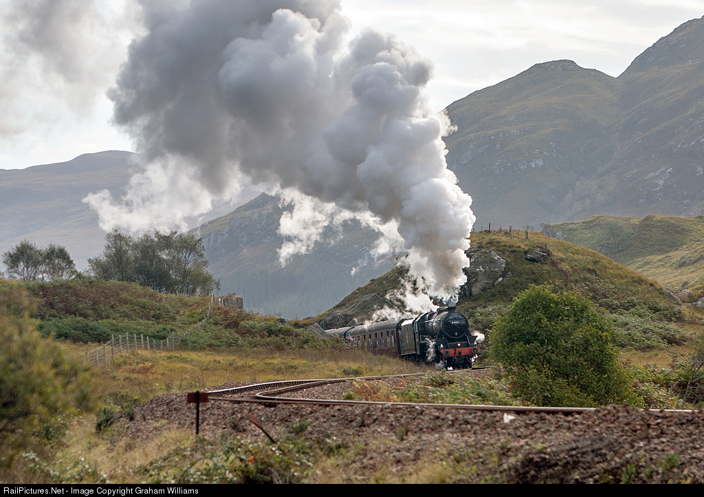 | Black Five no. 44871 attacks the climb, north of Glenfinnan in the West Highlands of Scotland, while it works the Jacobean service from Fort William to Mallaig |