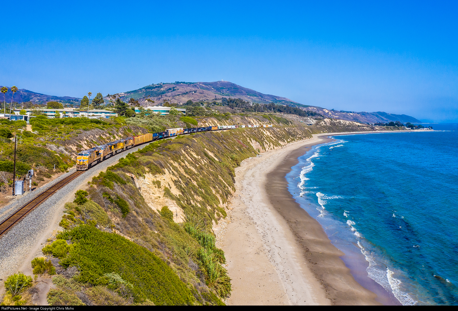 | The Guadalupe Hauler, with a good size train today, rolls along the Carpenteria Bluffs overlooking the Pacific ocean. |