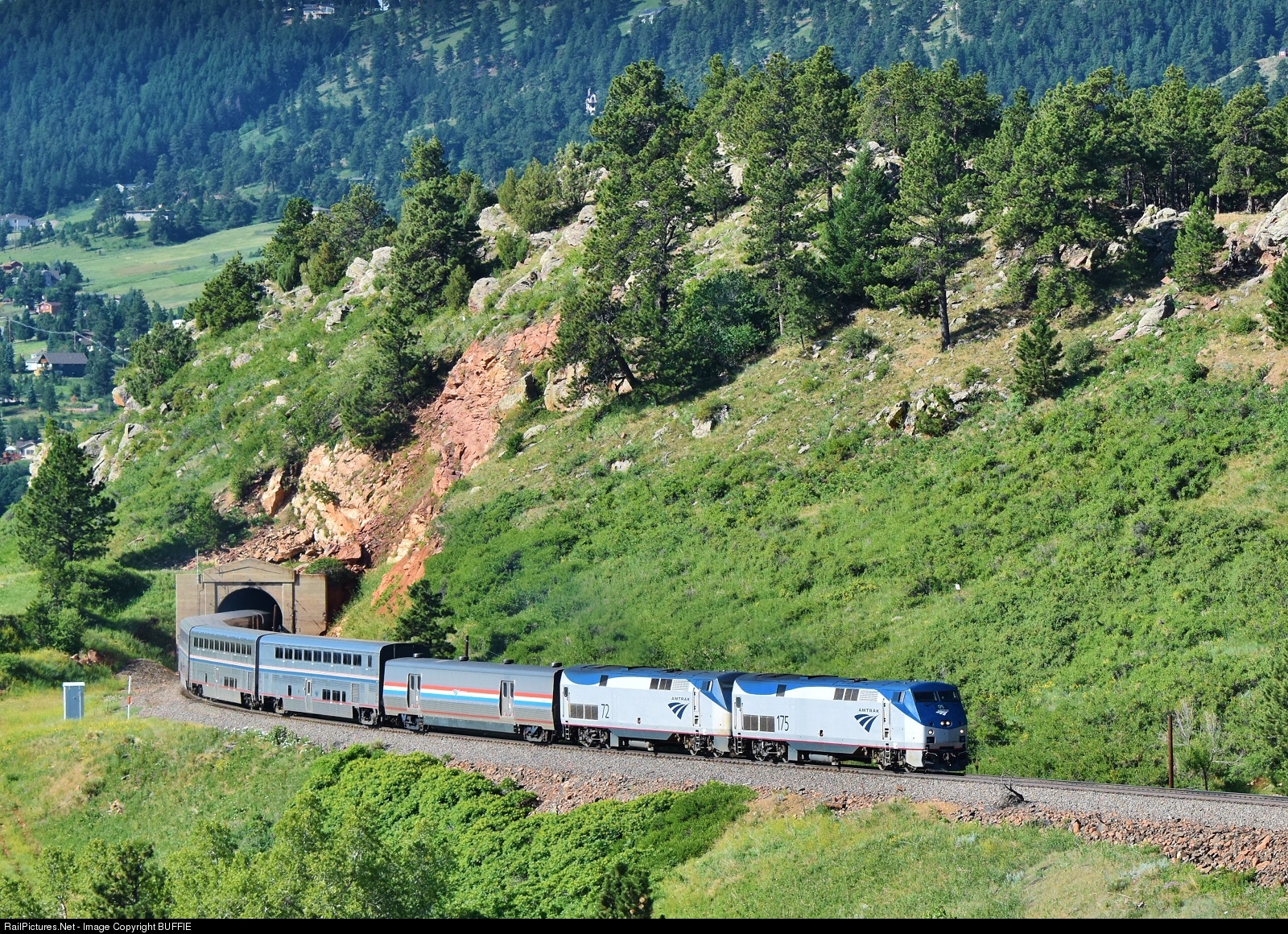 | The morning #5 California Zephyr emerges from Tunnel #1 as it begins the journey through 29 more tunnels including the 6 mile long Moffat Tunnel which will go under the Continental Divide and daylight at Winter Park, Colorado. |