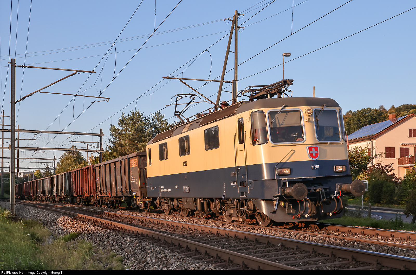| Re 421 # 387 (Re 4/4 II # 11387) of the International Rolling Stock Investment GmbH (IRSI) in the blue/cream "Rheingold" colors is pulling the more then 400 meter long train 69476 of TR Transrail from Islikon via Winterthur-Kloten-Regensdorf-Bözberg-Basel VL-Laufen to Delémont. The train has empty Eaos cars for sugar beets. The locomotive, built in 1984, was bought by the IRSI in autumn 2019 from SBB Cargo and got a revision and new paint scheme in Bellinzona in spring 2020. |