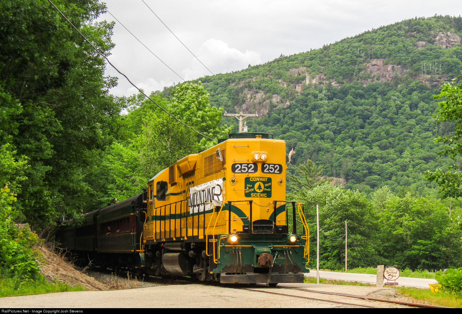 | June 27th, 2020 was the first run of the rebranded Notch Train into "The Mountaineer". This is a scenic passenger train that offers round trips between North Conway and Crawford Notch, NH. In the lead today was CSRX 252 with a banner saying "Mountaineer" hanging off the side of it. This was their return trip on the way back to North Conway. Taken at Notchland Rd in Hart's Location, NH. |