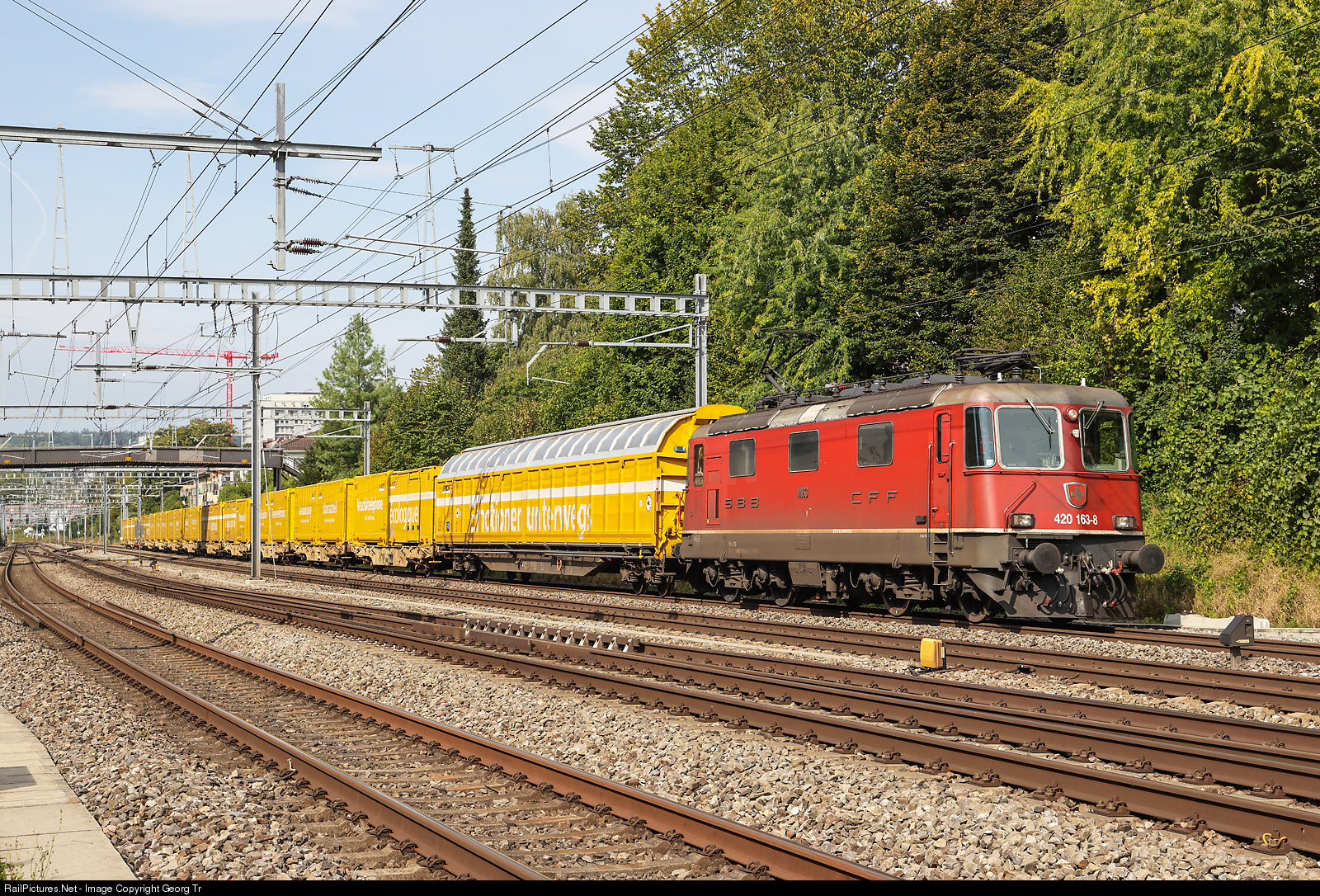 | Re 420 # 163 (Re 4/4 II # 11163) of the SBB is pulling the parcel mail train 50059 from Härkingen (mail sort center) to Frauenfeld, between Winterthur and Oberwinterthur. Behind the locomotive is a sliding doors car for letter transport, not usual in this train. |