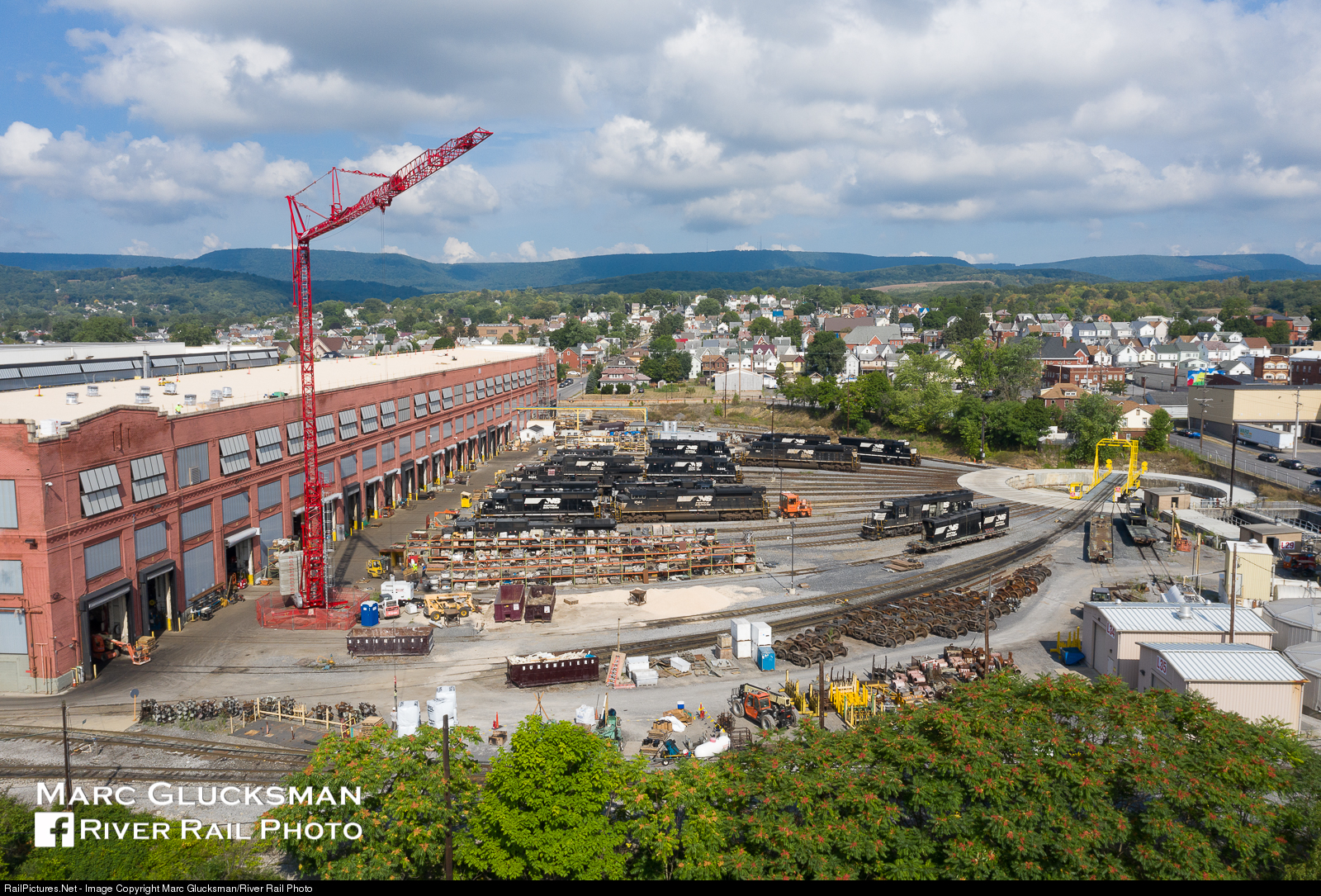Craning for a new angle. On August 14, 2020, a view of the Juniata Locomotive Shops in Altoona, Pennsylvania show a variety of locomotives parked outside the building. A temporary crane was erected to facilitate construction on the building, demonstrably taller than the structure itself. The yellow paint on the new turntable stands out in a sea of black and white engines.