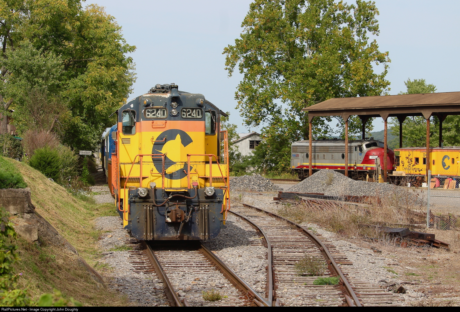 | Chessie B&O 6240 is on loan to help run the Potomac Eagle Scenic Railway passenger train while one of their engines is being repaired at the South Branch Valley Railroad diesel shop. To the right is an old Chessie caboose, and the former Gettysburg RR 1755. |