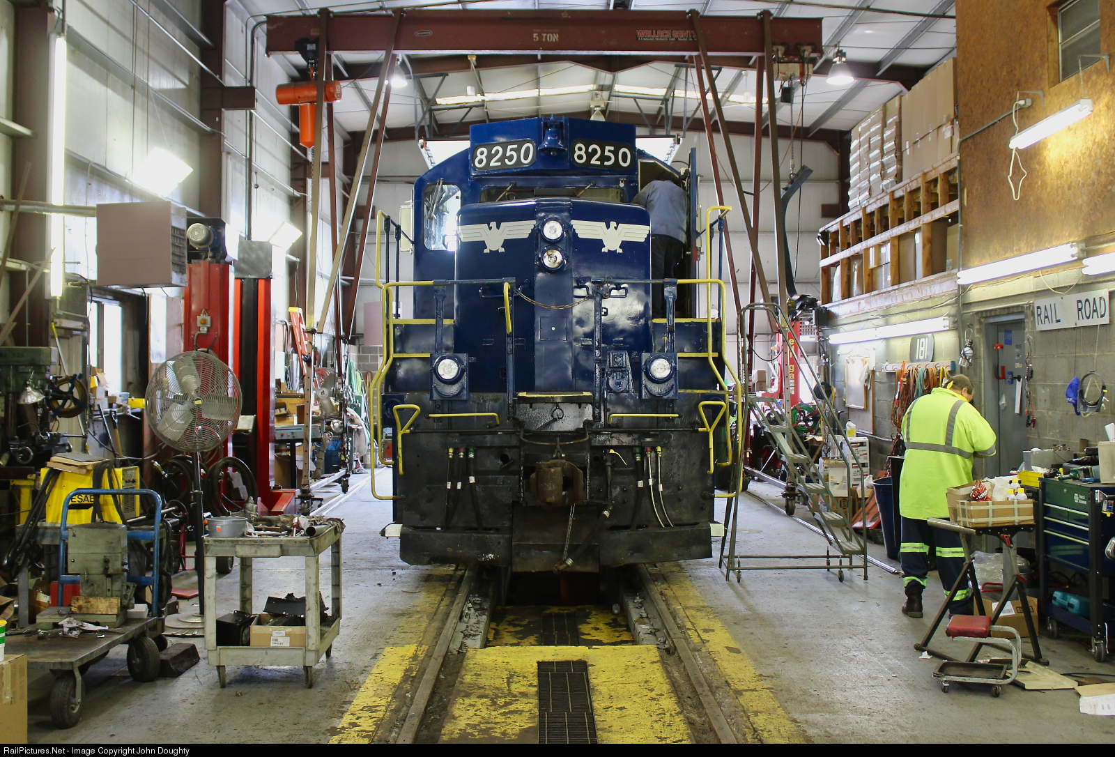| Workers at the South Branch Valley Railroad diesel shop work on the Potomac Eagle Scenic Railroad 8250. Since their engine was down for repairs, the South Branch Valley sent their Chessie B&O 6240 to help pull their passenger train out of Romney, WV. Photo taken with permission. |
