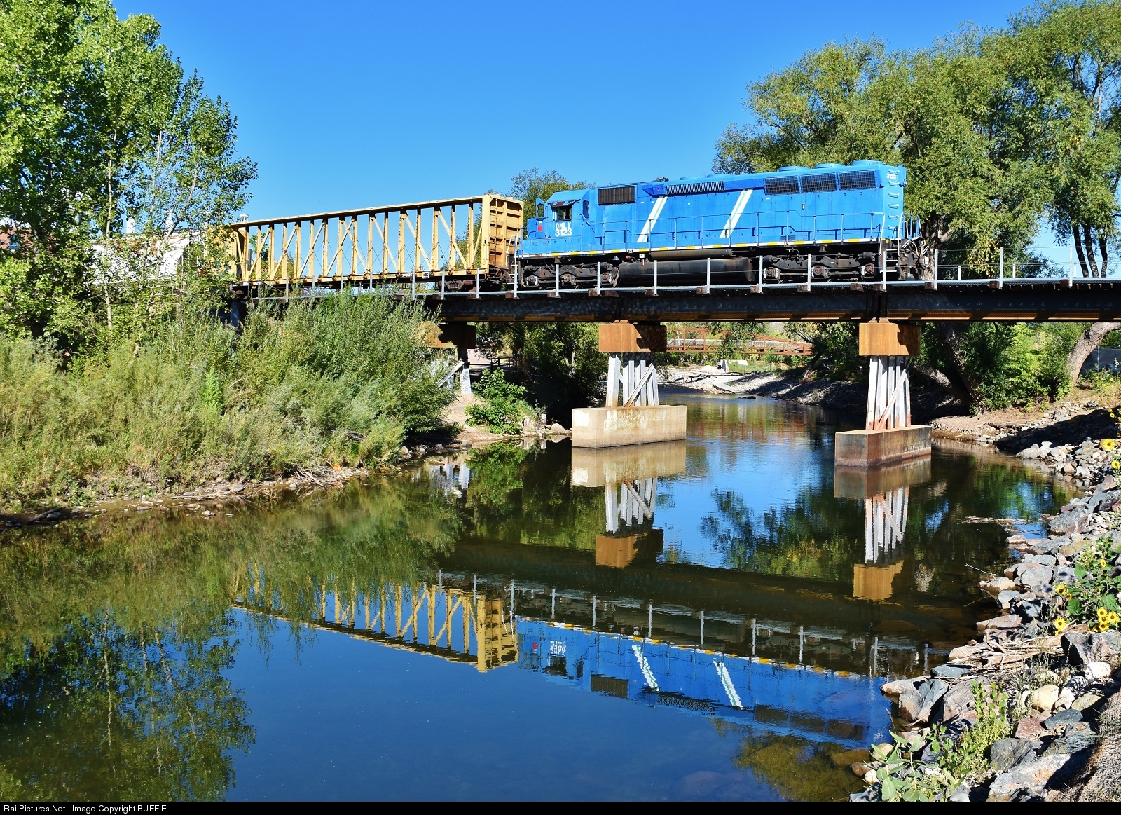 OmniTRAX 3123 (SD40M-2) runs long hood forward as it pulls a freight over the Cache La Poudre River in Fort Collins, Colorado.