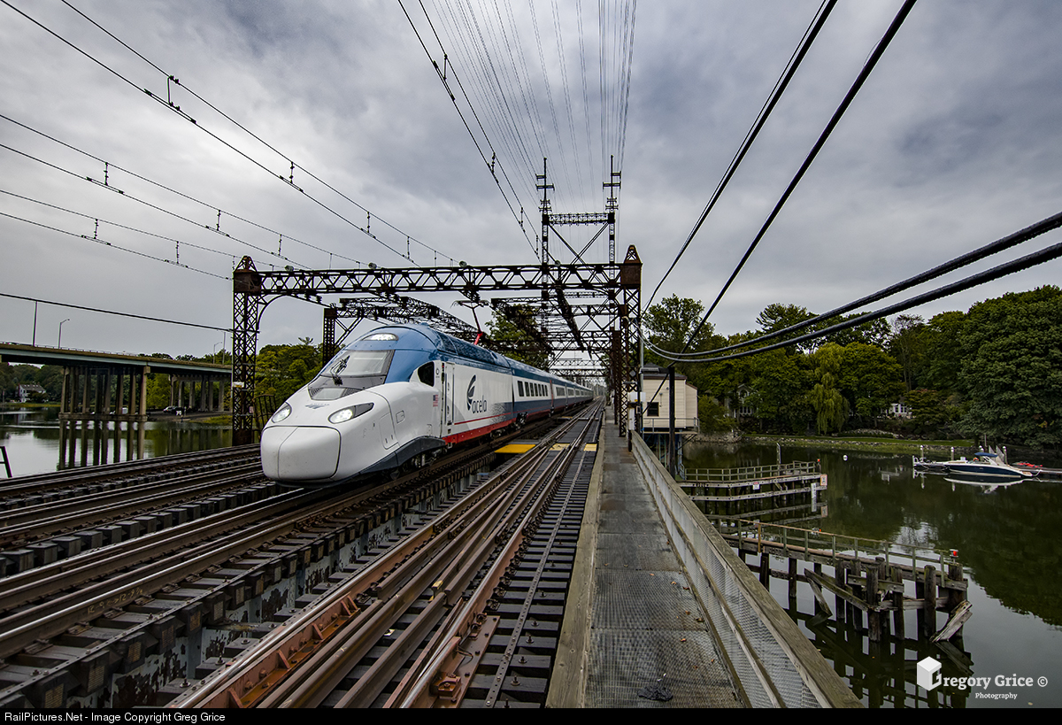 Amtrak's Alstom Avelia Liberty (Acela 21) heads west over Saugatuck River Railroad Bridge on Metro North's New Haven Line in Westport, Connecticut. The trainset is on it's way back to Philadelphia after a few days of test runs on the Boston-Westerly section of the Northeast Corridor. |