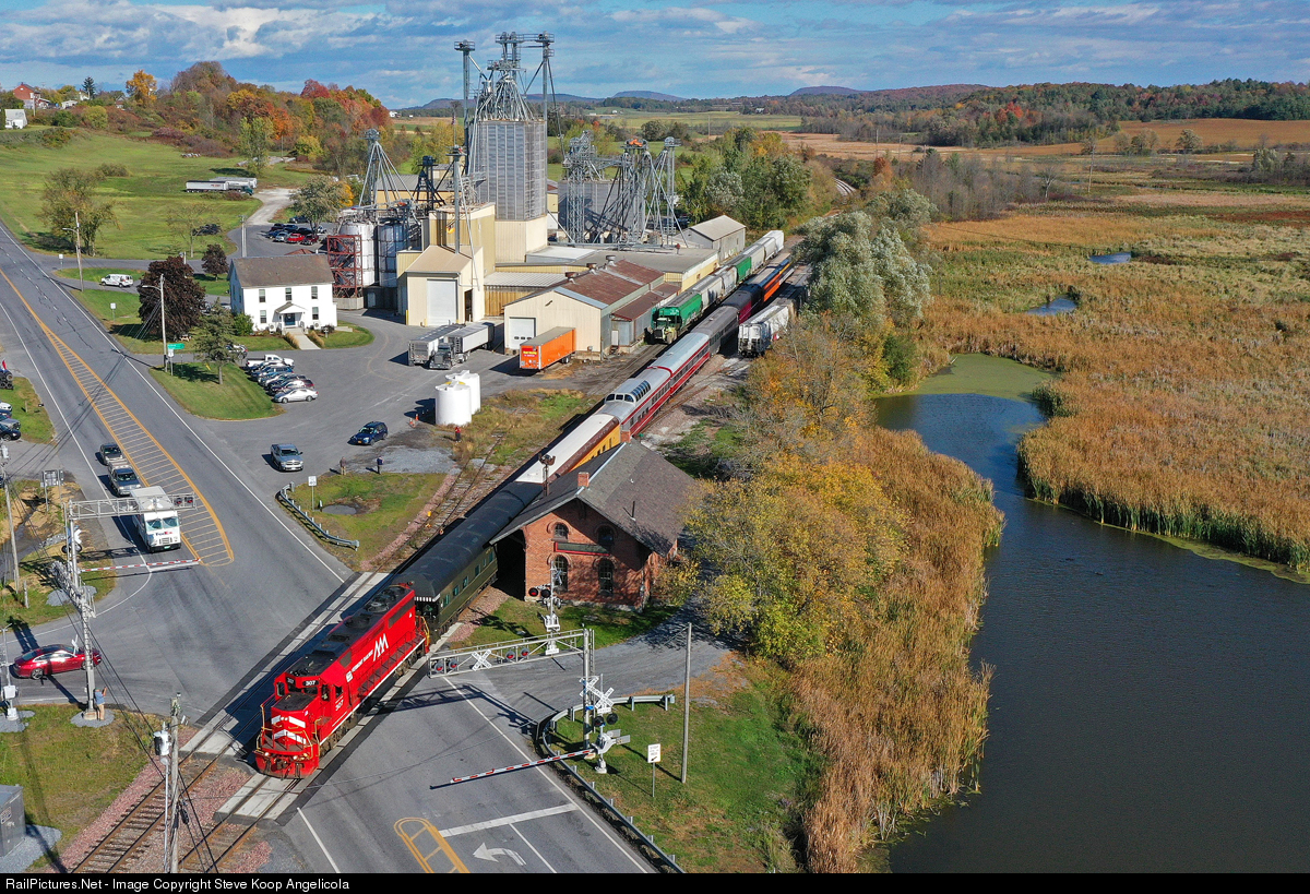 | The American Association of Private Rail Car Owners (AAPRCO) private car special passes through New Haven Junction, VT with the VTR 307 leading the trip from Burlington to Rutland. |