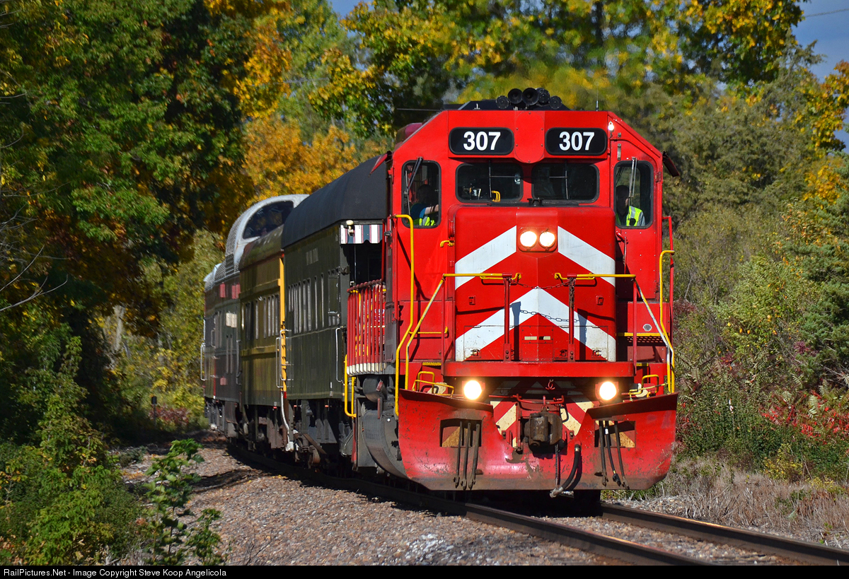 | The American Association of Private Rail Car Owners (AAPRCO) private car special passes through Vergennes, VT with the VTR 307 leading the trip from Burlington to Rutland. |