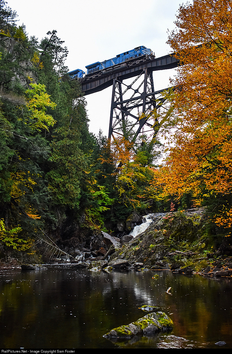 Lake Superior & Ishpeming’s Yard-Hill job passes over the Dead River trestle with a pair of CEFX units for power.